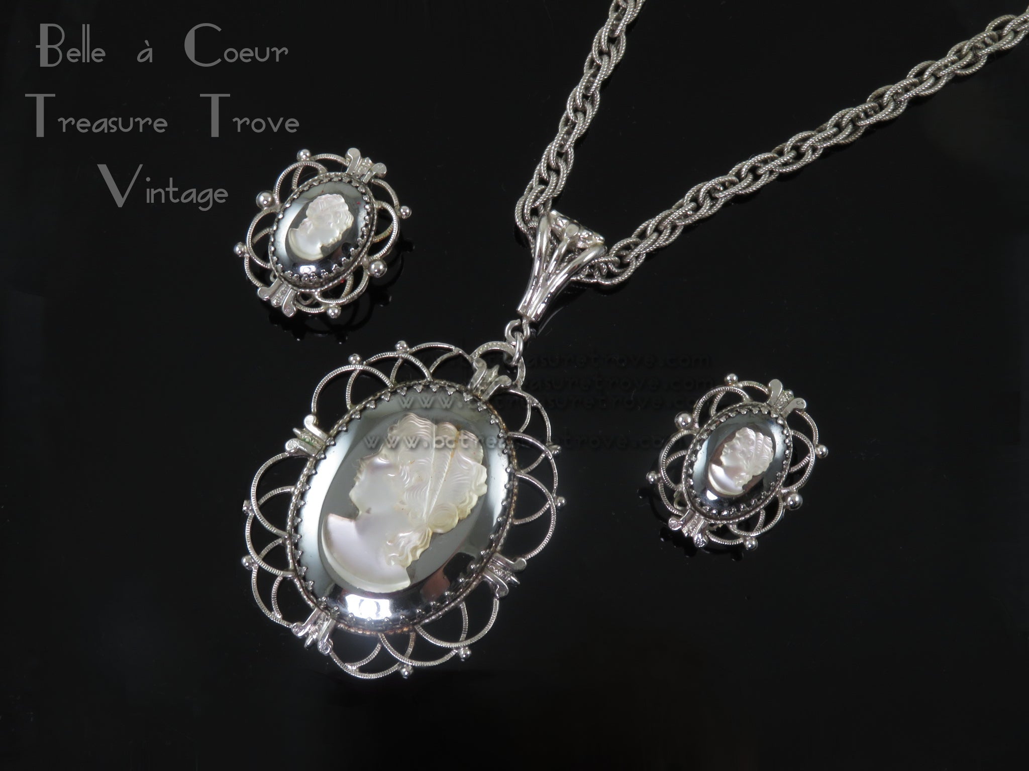 Whiting & Davis Cameo Hematite Pendant Necklace and Earrings Set Vintage