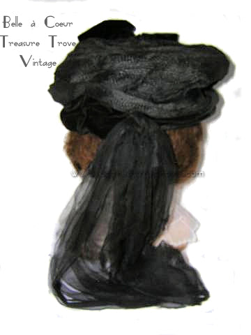 This is a superb antique black Edwardian toque hat and veil, circa 1910 - Titanic era (1912). It may have been used for mourning. Fashioned of woven or braided straw bands over a millinery wire form and lined with black silk. There is a wide black velvet ribbon that encircles the hat and forms a large, wired bow at the front. A black silk veil decorated with chenille balls is attached at the back with a straight pin that is, in my opinion, a mourning pin – dull black head and a blued steel pin). Of course, we have no way of knowing if this is original to the hat, but it is most certainly old and of the period.