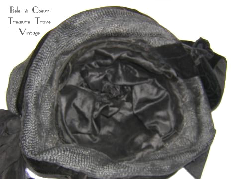 Condition:  The condition of this elegant hat is excellent. I can find no flaws in the straw or ribbon and the silk lining has only a harmless, loose thread at the seam. The veil is fragile and it does have a few holes and small tears - please be sure to view all the photos.