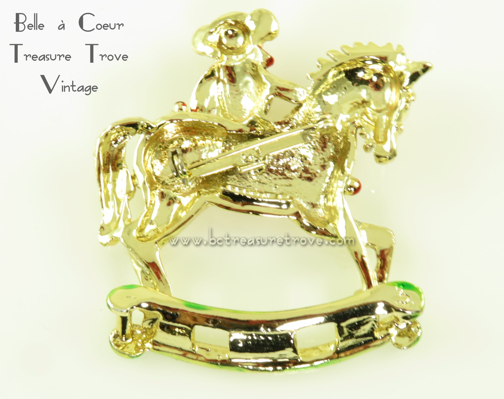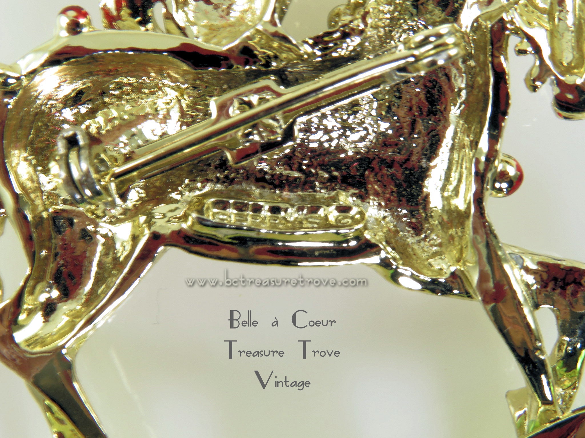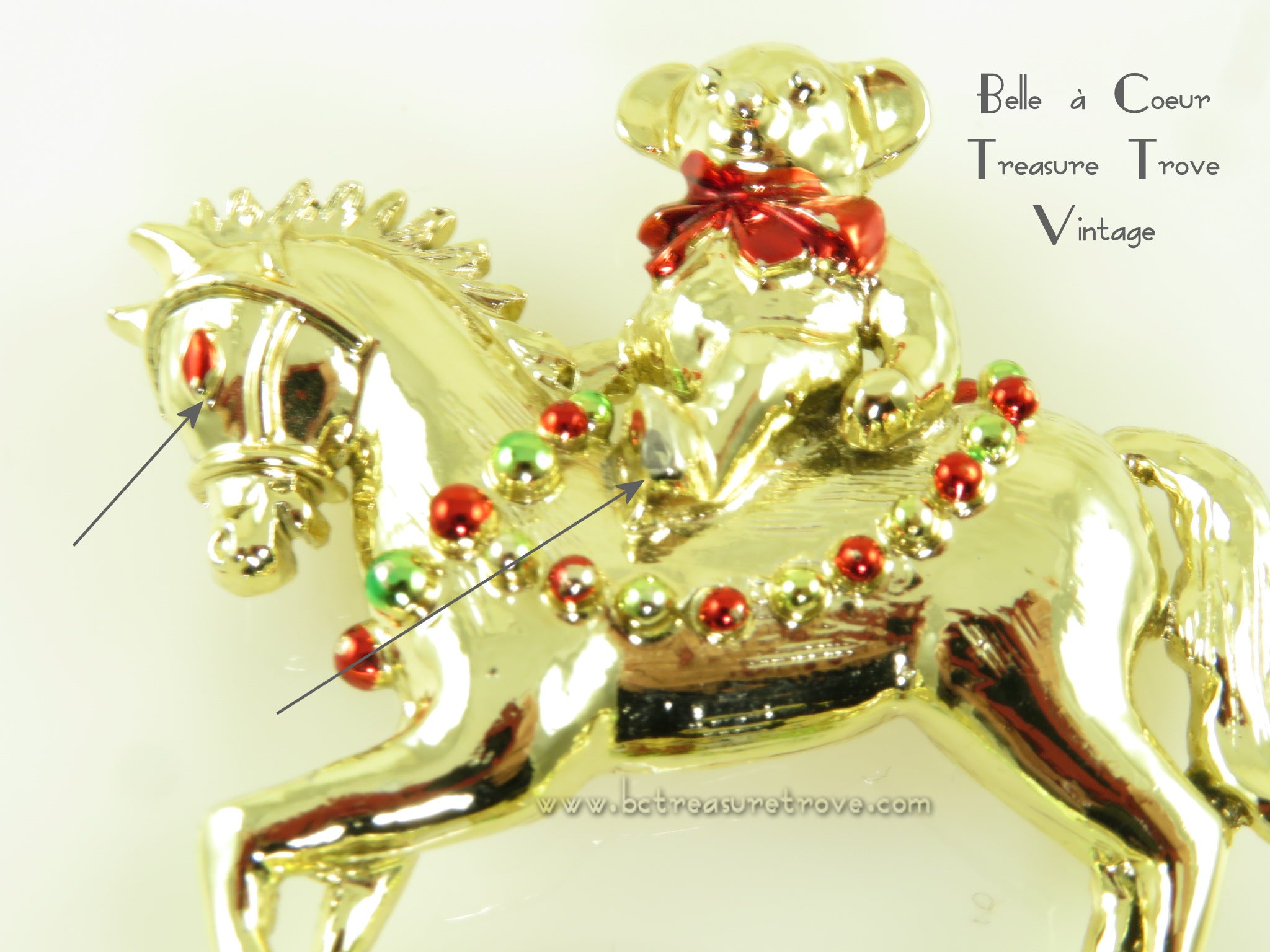 Condition: Very good. Most of the green coloring on the garland on the horse is missing although the goldtone is shiny and the loss is not really noticeable. The horse's red colored eye is missing a bit of the red at the bottom tip - this looks more like a manufacturing flaw - again, not really noticeable. And the tip of the teddy bear's foot has loss of the goldtone plating and is down to bare metal. This is very small and is very difficult to see without magnification. I have included a photo with arrows pointing to the red eye and the teddy bear's foot. The safety clasp is in fine working order.