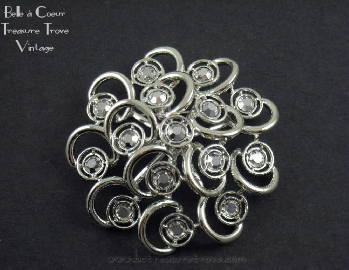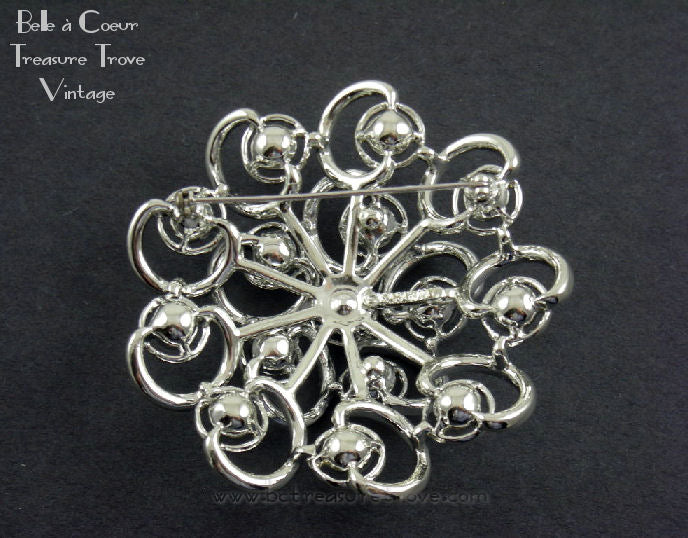 Sarah Coventry jewelry called this design “Celestial Ice" and it’s easy to see why. Dating to the early 1960s, this enormous and incredibly beautiful vintage pin really does sparkle like ice! Faceted glass stones are coated with silver metallic with large swirls of silver tone metal surrounding them – very atomic 1960s style! It’s quite large and looks quite stunning on the lapel of a black or dark color coat or blazer.
