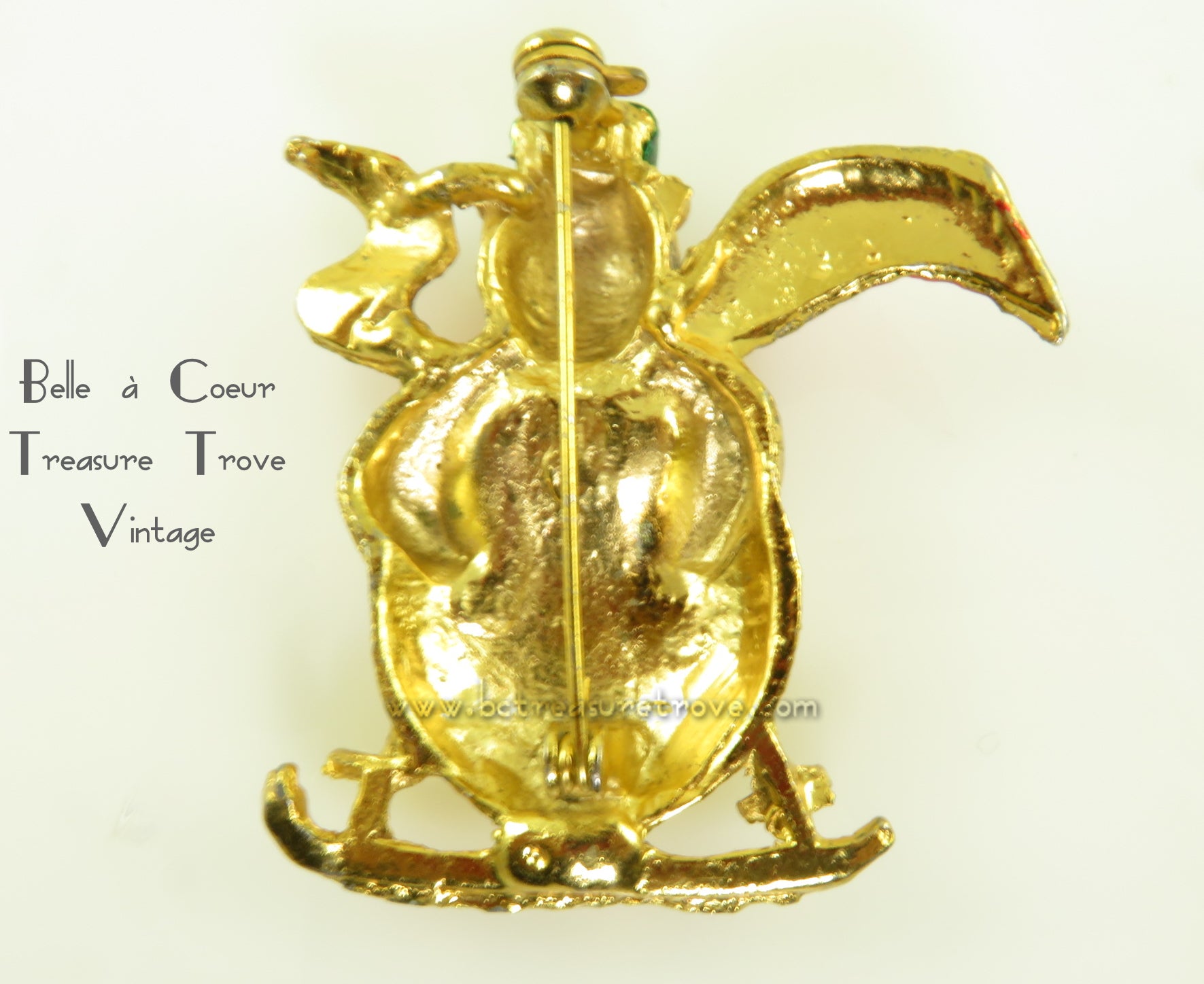 Condition: Very good +++ There is a bit of loss to the green and the red coloring. The photos show that the polished goldtone is rather rough looking - it really is not, but the base metal is not smooth and therefore gives the impression that the plating is uneven. Priced to reflect condition although most flaws are not visible without magnification.
