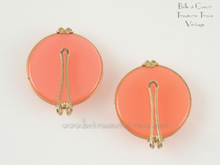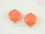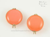 These vintage 1960s Castlecraft button earrings are so bright and cheerful! Made of tangerine orange moonglow Lucite with gold filled square wire findings. They slide onto the ear, rather than clip on.