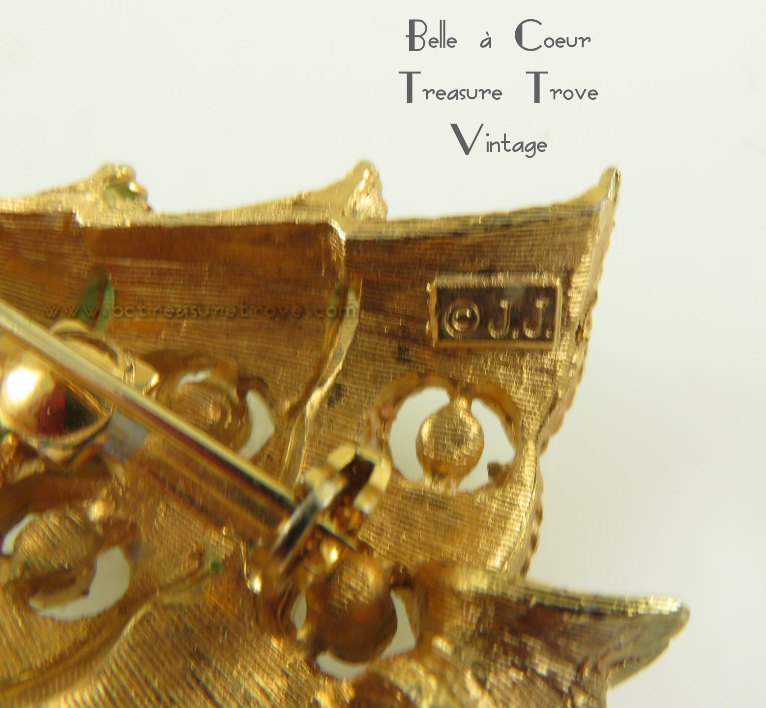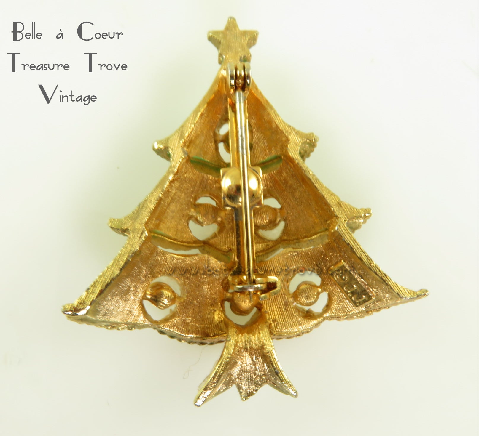 This super cute vintage Christmas tree brooch signed J.J. features green over gold tone metal and multicolor rhinestones. Textured goldtone metal create a twist of loopy garland.