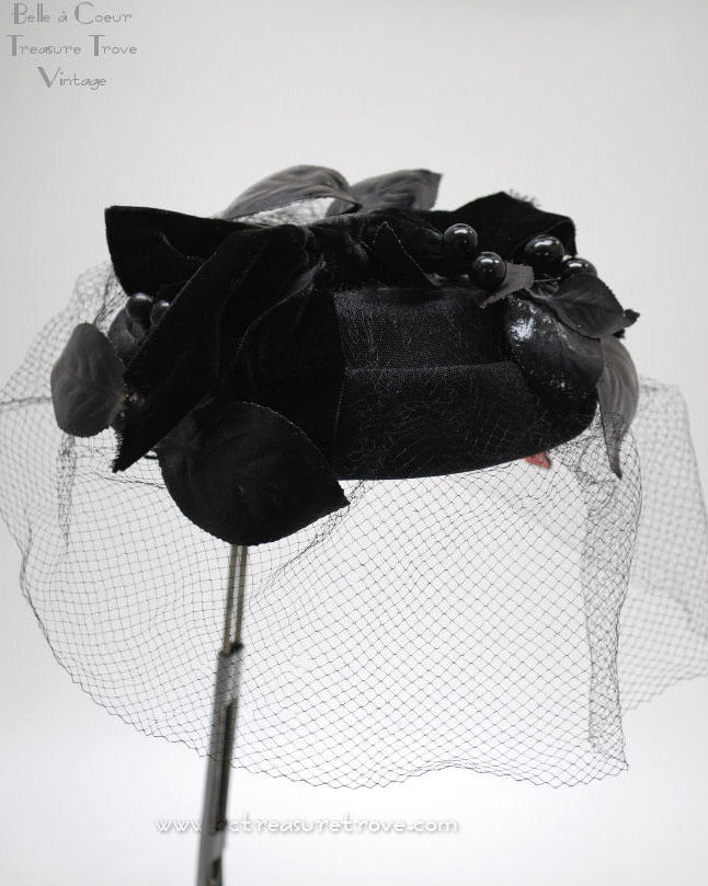This is the prettiest little vintage hat from the mid-1950s with a Mr. John Demi Chapeau label. It is black and is decorated with a big black velvet bow, black fabric leaves, and black berries. A black veil is attached. Based on the black leaves and berries, this sweet little hat could well be used for mourning. This is a small, cocktail style hat that sits on top of the head. It has 2 small combs on each side to hold the hat in place.