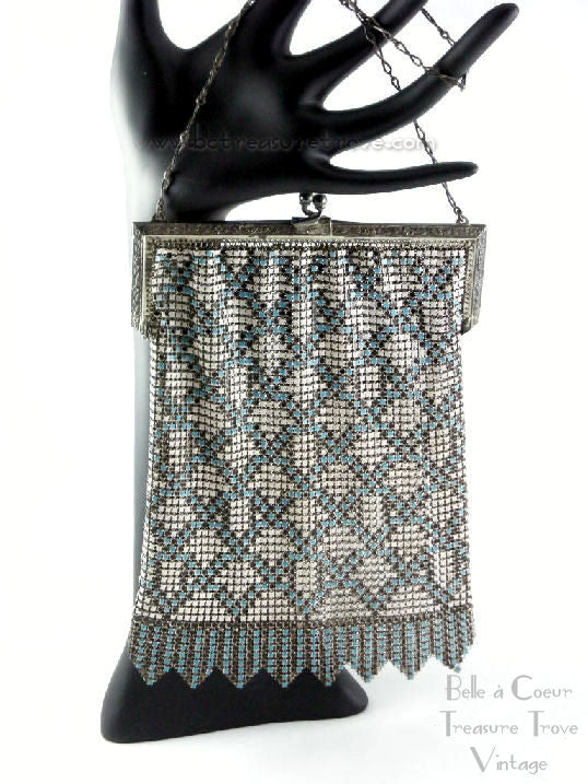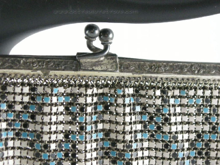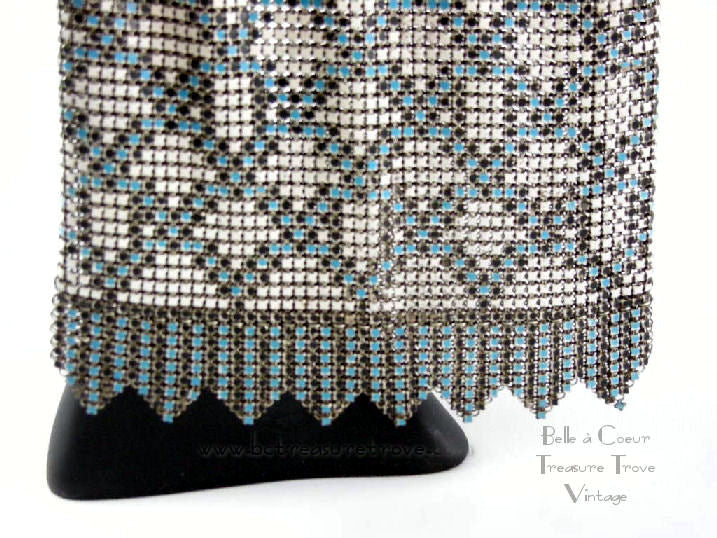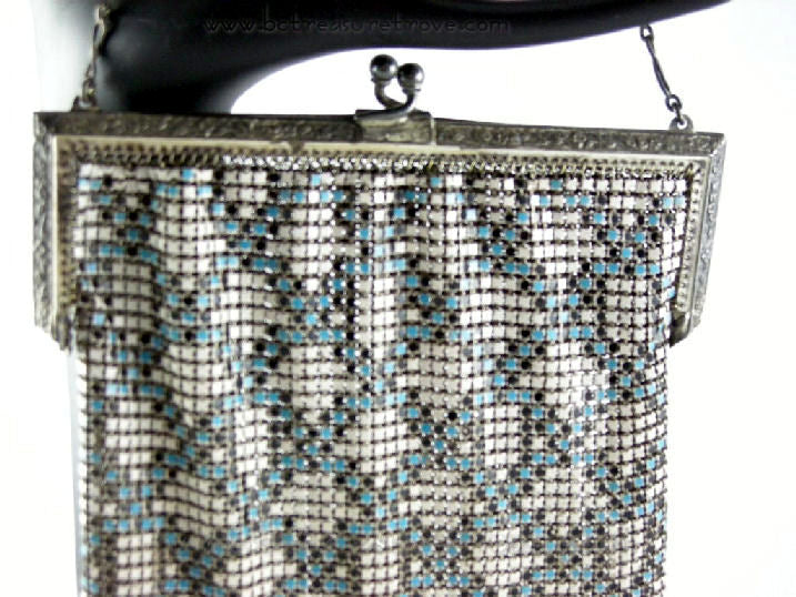 Vintage Whiting & Davis Enamel Mesh Purse – Art Deco – Turquoise, White, Black
